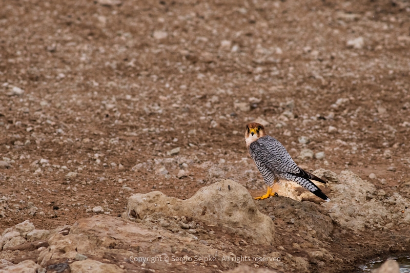A circling Tawny Eagle attracted our attention a little further on and, when it landed on the ground at a wildebeest-carcass and started feeding, it didn’t take long to find a lone male Cheetah resting in the shade after eating its fill. Everyone enjoyed far better views of this Cheetah compared to the brief glimpses earlier. We returned to camp late-morning. A late afternoon drive along the Nossob-river produced a lone Lioness and an unforgettable sight of a pair of Red-necked Falcons drinking and bathing at the Samevloeiing-waterhole in an unexpected rain-shower. There was a lot of talk about our sightings in the Kgalagadi over the previous two days at supper that evening, but most agreed that the falcons at the waterhole will be a lasting memory. Raptor species observed: 15. Raptor sightings recorded: 39.