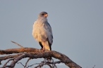 Probably one of our best days of raptor-viewing started with a drive along the dry Nossob-riverbed in the same direction we travelled the day before. We encountered a range of species which included Verreaux’s Eagle Owl, Lanner Falcon and Pale Chanting Goshawks of various ages. Our stop at the waterhole again produced the juvenile Gabar Goshawks of the day before and, while we were scanning the area for other birds and animals, Bud pointed out a small raptor perched on a snag about 100 m from our vehicles. Closer scrutiny revealed our first Red-necked Falcon, a first for many in the group. A few kilometres further a large male Lion was encountered lying in the shade of a large tree, and some time later another waterhole produced Montagu’s Harrier and range of other raptors previously seen, including a rather nervous Amur Falcon looking at a soaring pair of Lanner Falcons overhead.